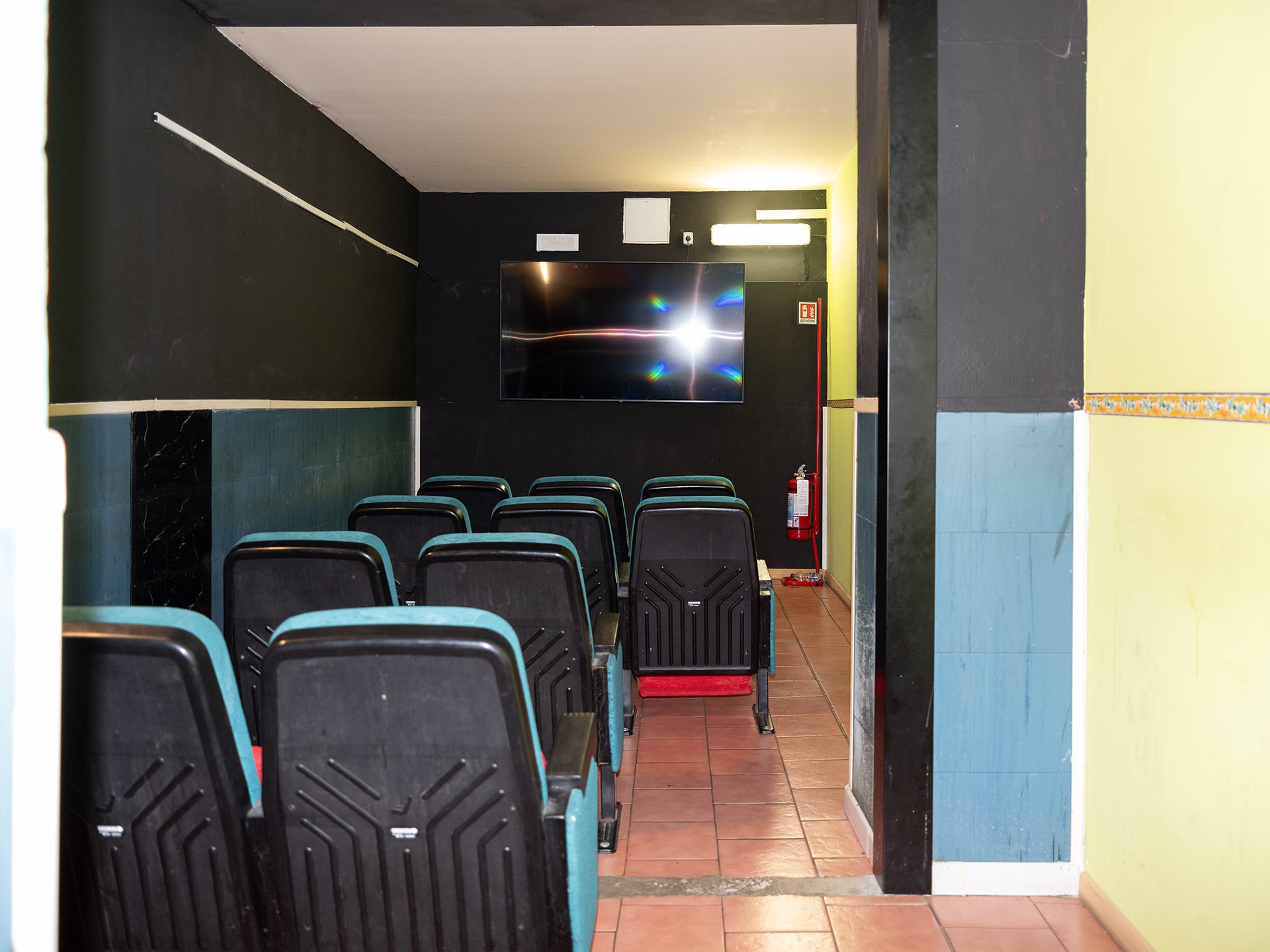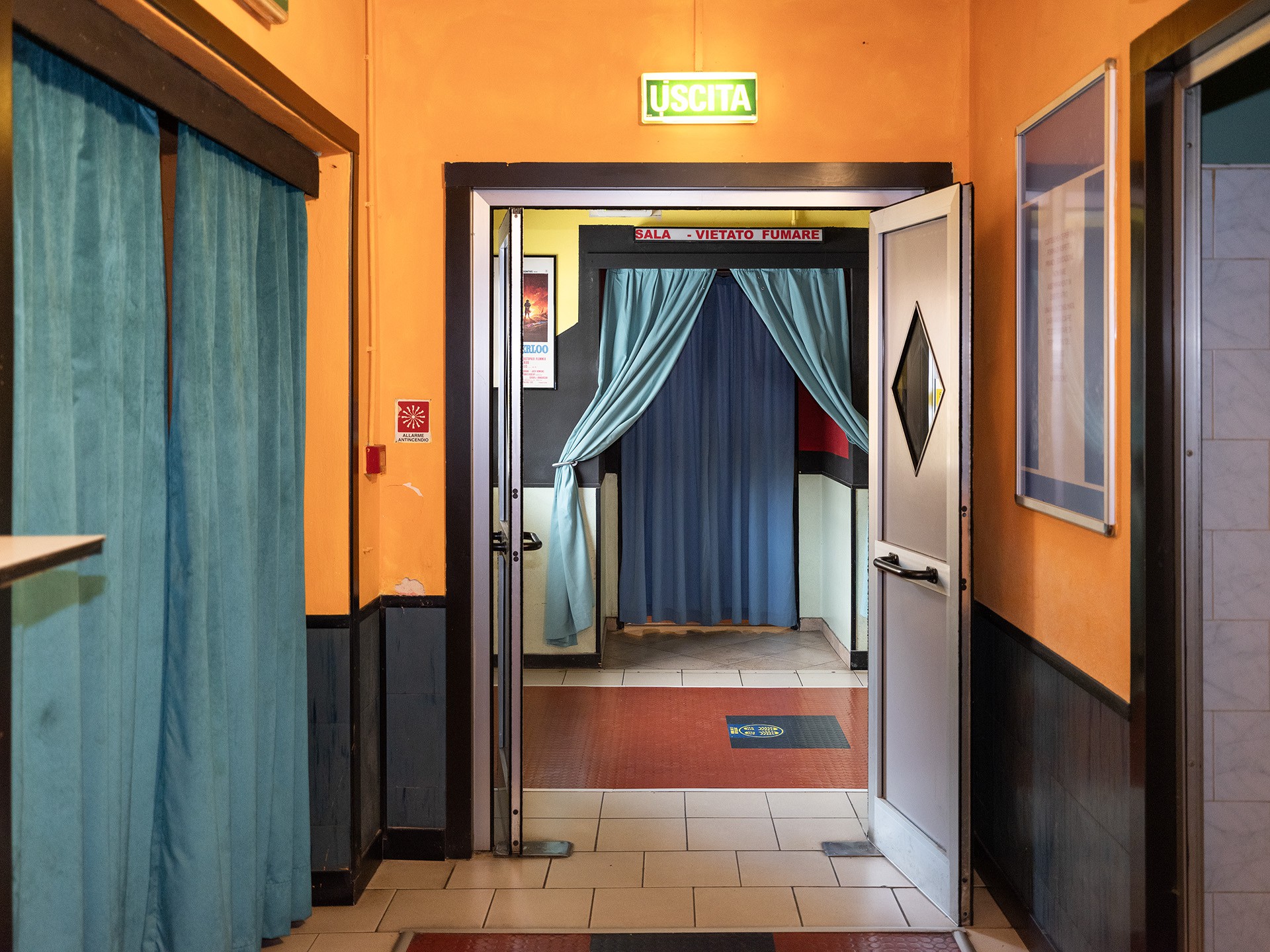 The photo series I Press the Button offers a glimpse into a cinema located in the frontier zone between Italy and Switzerland. Shaped by the geographical and political tensions of this border region, this cinema has become a space of escape and refuge for its visitors, as well as a site of transgression and clandestine, (un)easy encounters—showcasing pornographic films for both heterosexual and homosexual audiences.