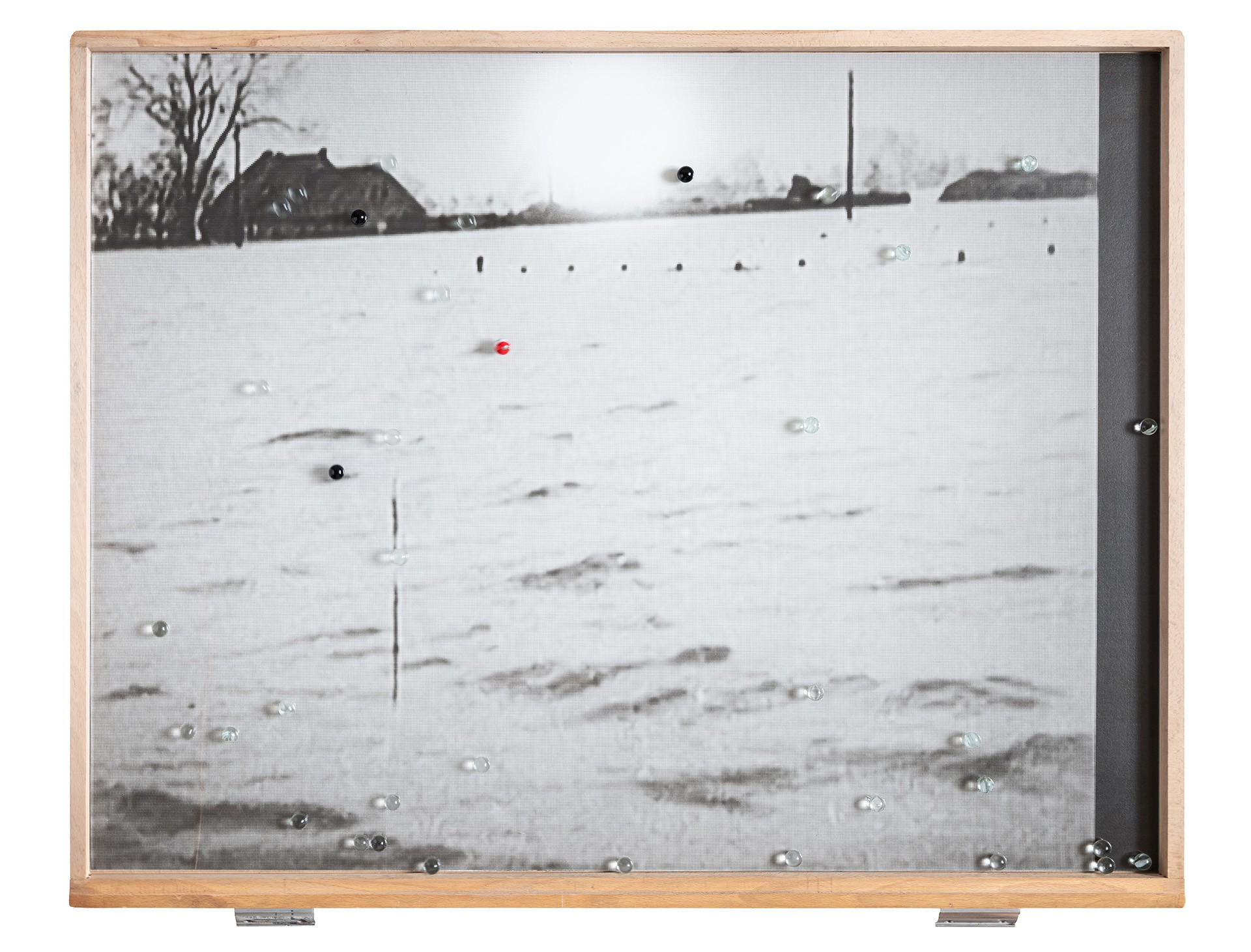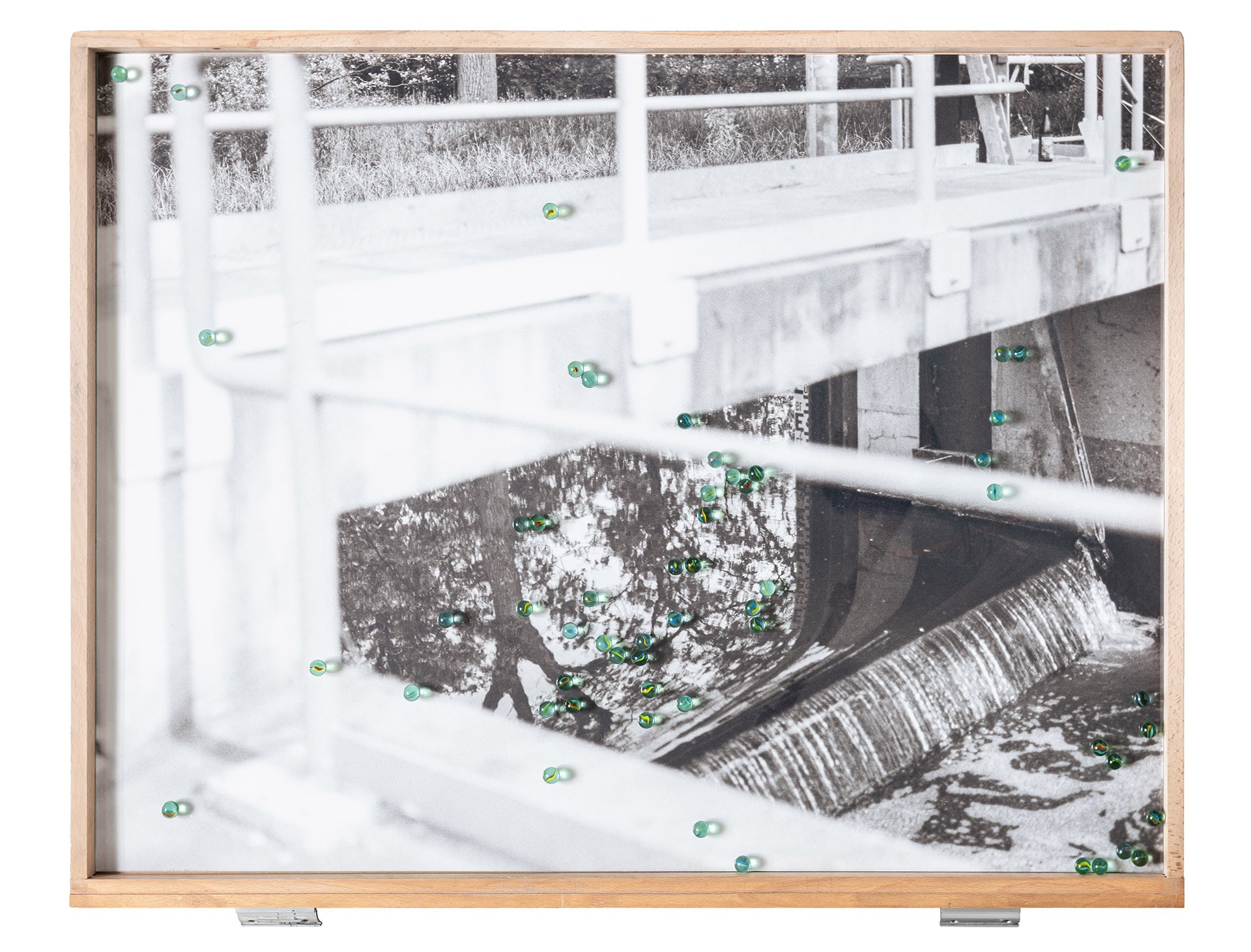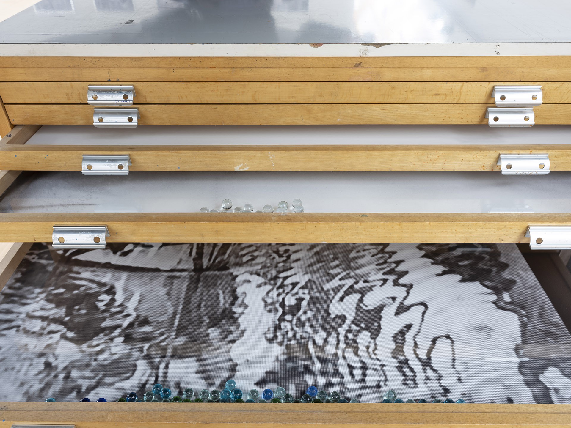 Untitled, Inkjet print, 101,5x77,9 cm (framed in a drawer), marbles, glass, 2025