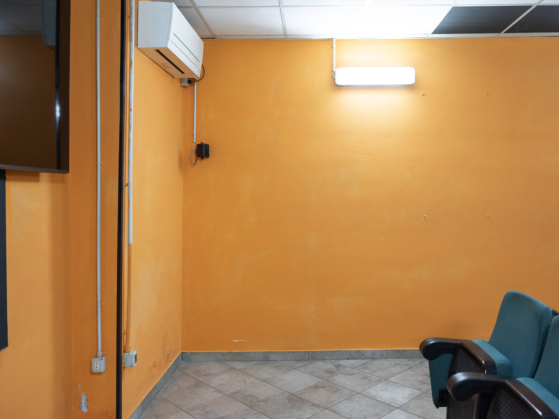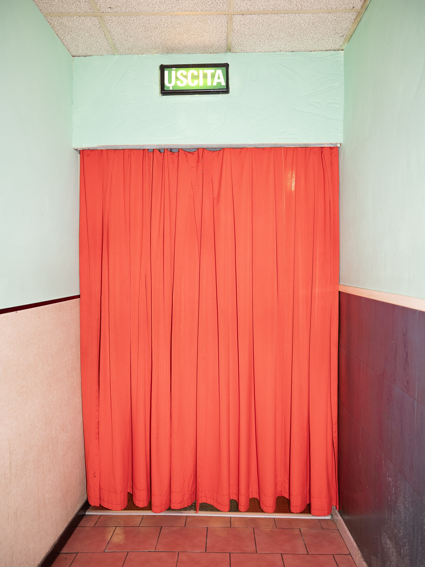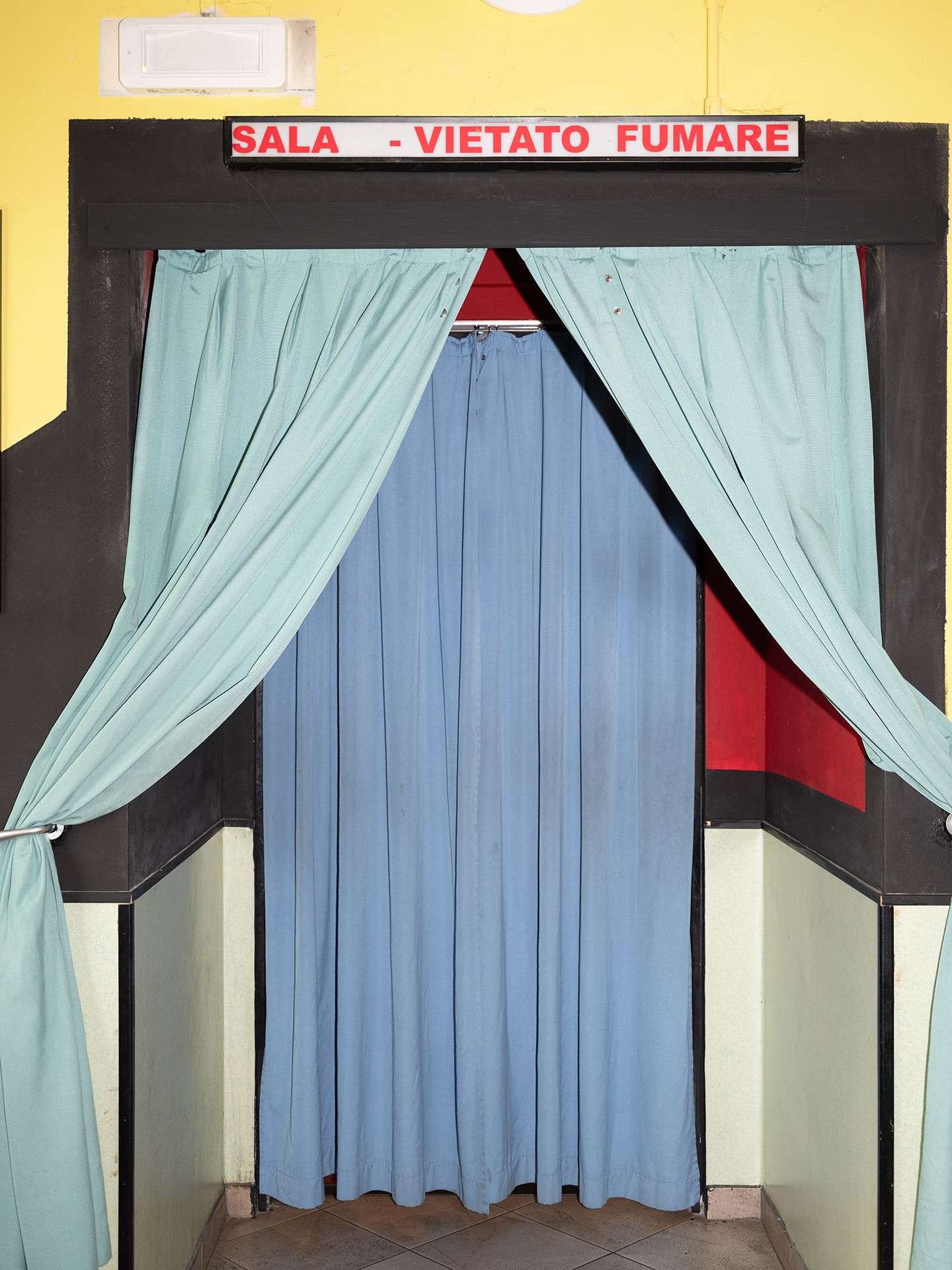 The photo series I Press the Button offers a glimpse into a cinema located in the frontier zone between Italy and Switzerland. Shaped by the geographical and political tensions of this border region, this cinema has become a space of escape and refuge for its visitors, as well as a site of transgression and clandestine, (un)easy encounters—showcasing pornographic films for both heterosexual and homosexual audiences.