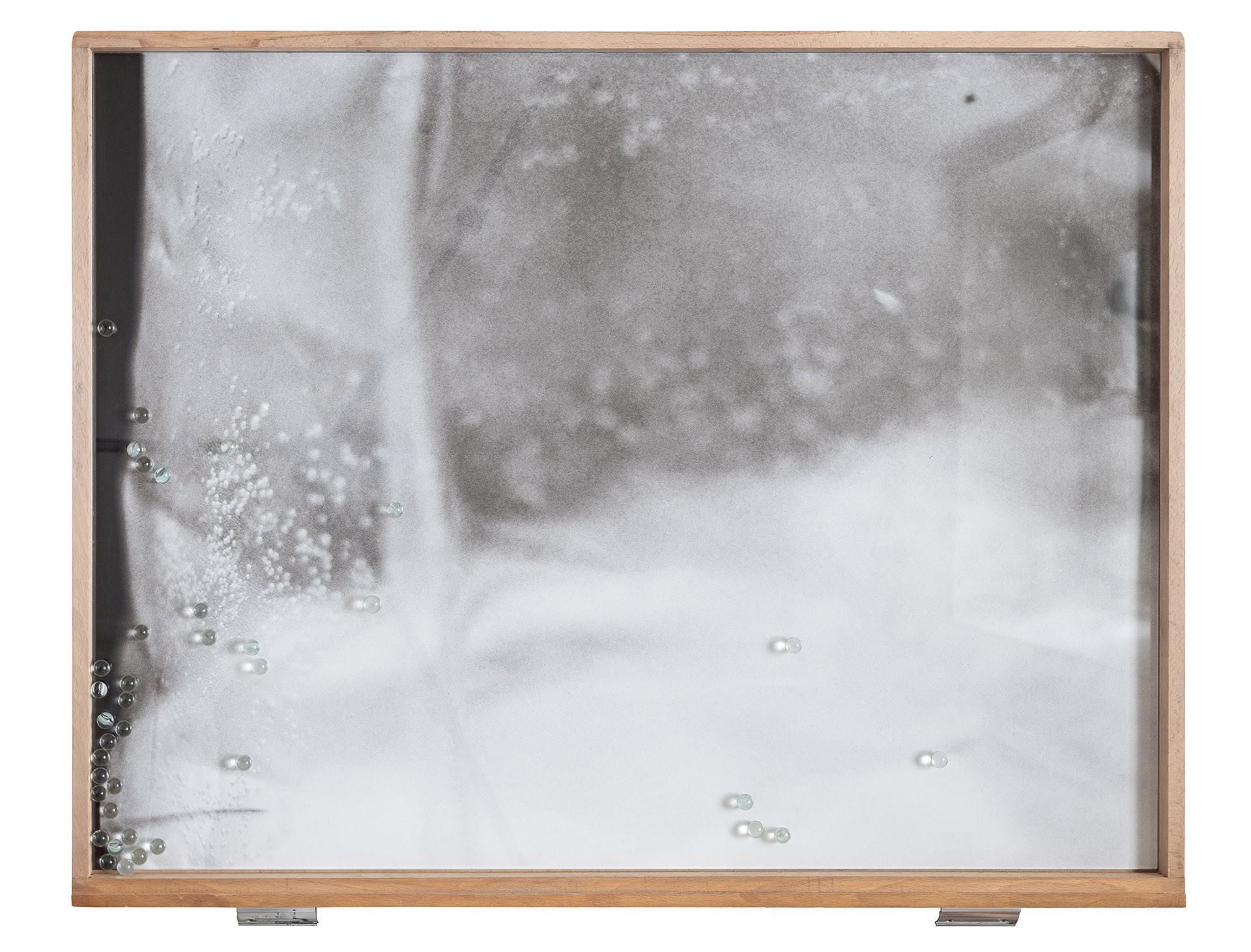 Untitled, Inkjet print, 101,5x77,9 cm (framed in a drawer), marbles, glass, 2025