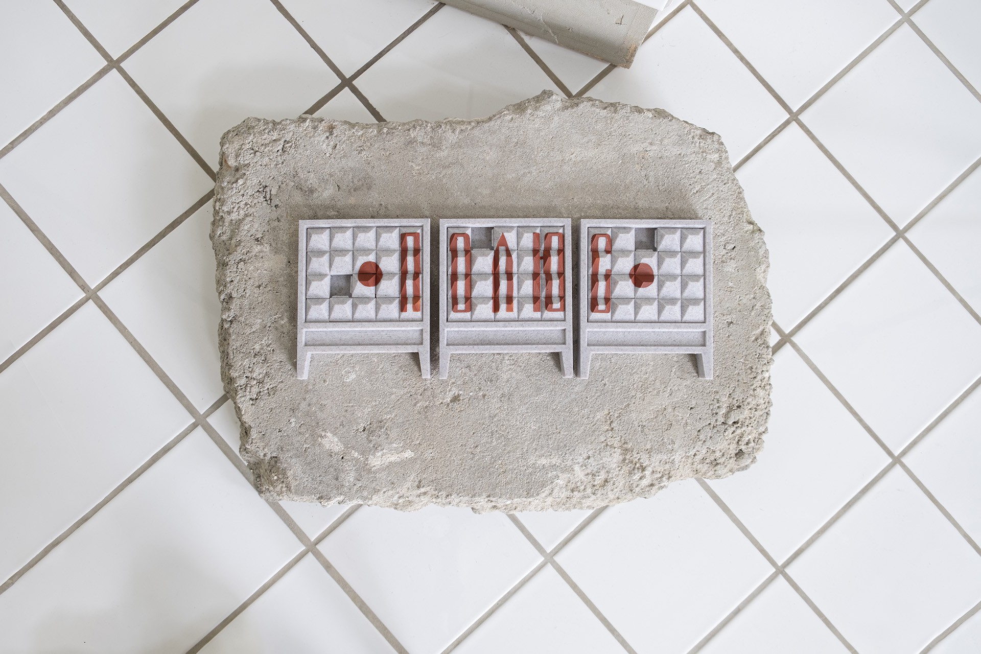 Sliding Puzzle POLUS, 3D print, PLA filament, acrylic, concrete, H: 13 cm W: 33 cm D: 1,5 cm, 2023